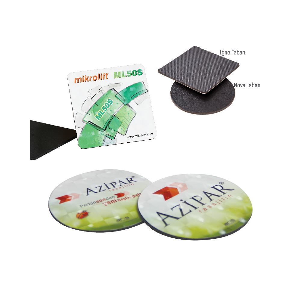 8,75 x 8,75 cm Kare veya 8,8 x 8,8 cm yuvarlak / 2.8 mm nova yada, 2.6 mm iğne desen taban / 4 renk baskı, PVC kaplama