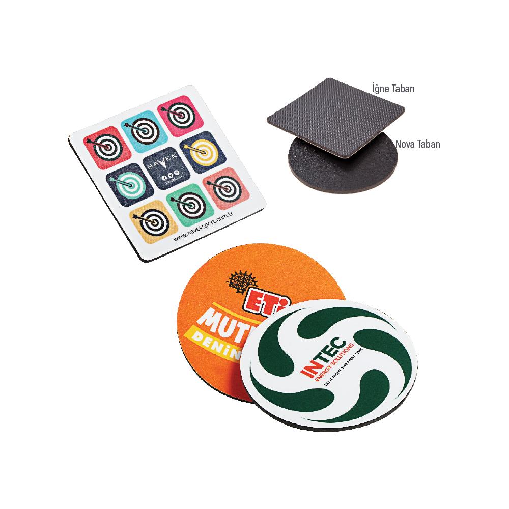 8,75 x 8,75 cm Kare veya 8,8 x 8,8 cm yuvarlak / 2.8 mm nova yada, 2.6 mm iğne desen taban / 4 renk baskı, PVC kaplama